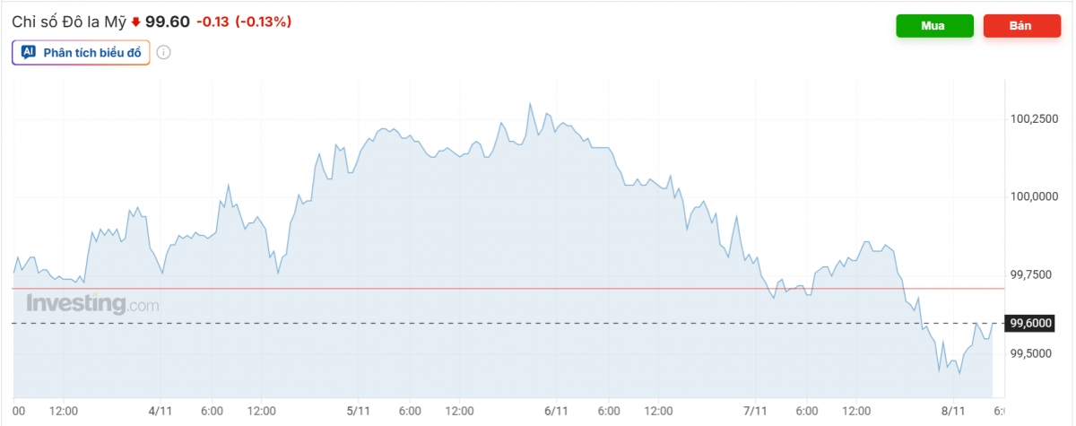 Trên thị trường thế giới, chỉ số USD index (DXY) biến động quanh mốc 100 điểm. Mức thấp nhất trong tuần được ghi nhận tại 99,60 điểm, cập nhật chiều tối Chủ Nhật.