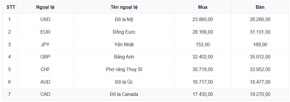 Tỷ giá các ngoại tệ mạnh khác trong giỏ thanh toán quốc tế, tại Ngân hàng Vietcombank được niêm yết như sau: