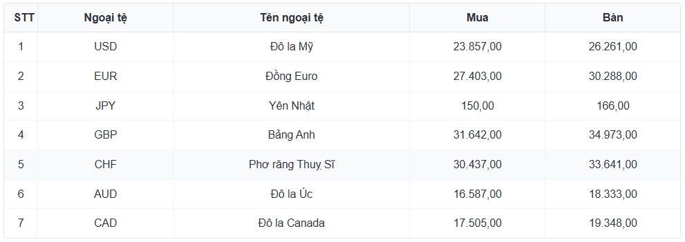 Tỷ giá các ngoại tệ mạnh khác trong giỏ thanh toán quốc tế, tại Ngân hàng Vietcombank được niêm yết như sau: