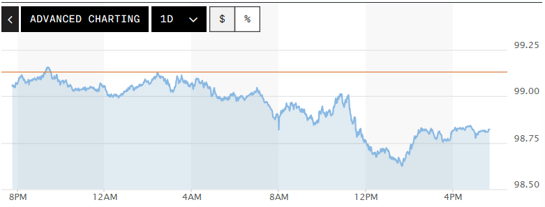 Biểu đồ biến động Chỉ số DXY trong 24 giờ qua. Ảnh: Market watch