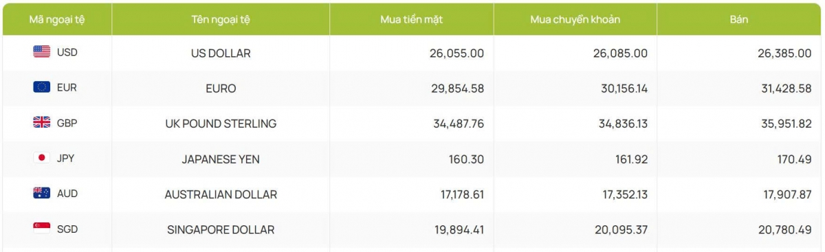 Ngân hàng Vietcombank niêm yết tại 26.055 - 26.385 đồng/USD (mua vào và bán ra), giữ nguyên cả hai chiều so với phiên trước.