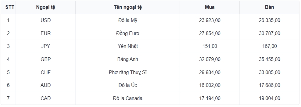 Tỷ giá các ngoại tệ mạnh khác trong giỏ thanh toán quốc tế, tại Ngân hàng Vietcombank được niêm yết như sau:
