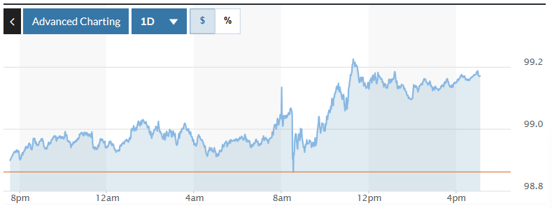 Biểu đồ biến động Chỉ số DXY trong 24 giờ qua. Ảnh: Market watch