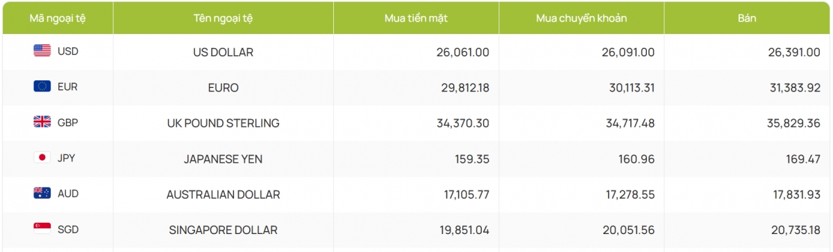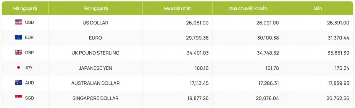Cụ thể, ngân hàng Vietcombank công bố giao dịch ở mốc 26.061 - 26.391 đồng/USD (mua vào và bán ra), giữ nguyên từ phiên trước đó.