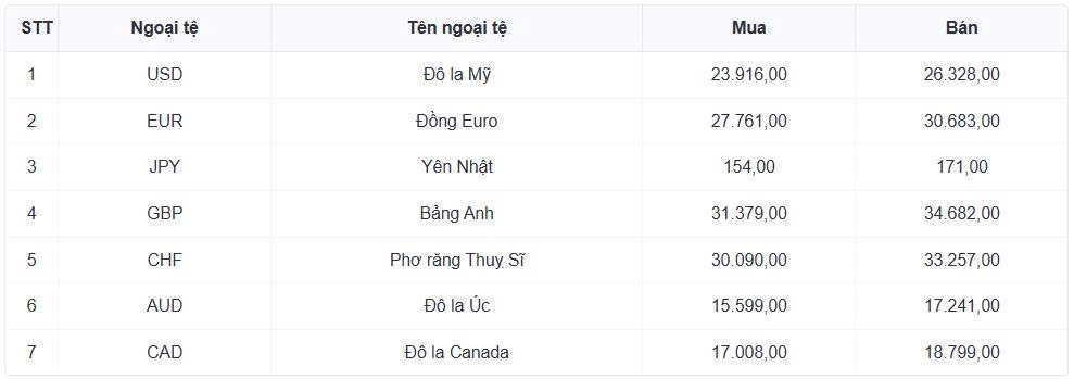 Tỷ giá các ngoại tệ mạnh khác trong giỏ thanh toán quốc tế, tại Ngân hàng Vietcombank được niêm yết như sau: