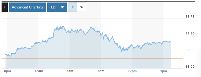 Trên thị trường Mỹ, chỉ số US Dollar Index (DXY) đo lường biến động đồng bạc xanh với 6 đồng tiền chủ chốt (EUR, JPY, GBP, CAD, SEK, CHF) tăng 0,26%, hiện ở mức 98,40.