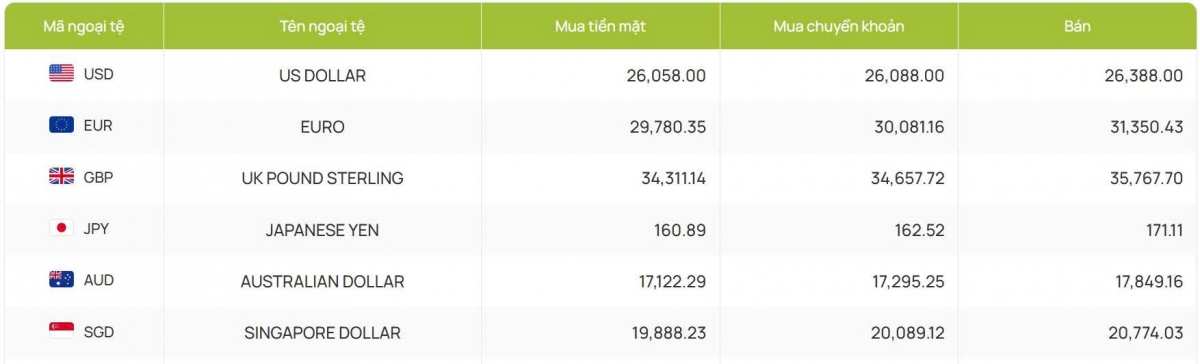 Còn ACB bắt đầu hôm nay giao dịch với 26.060 đồng/USD mua vào và 26.388 đồng/USD bán ra, giữ nguyên giá mua và tăng nhẹ 1 đồng chiều bán so với phiên trước đó.