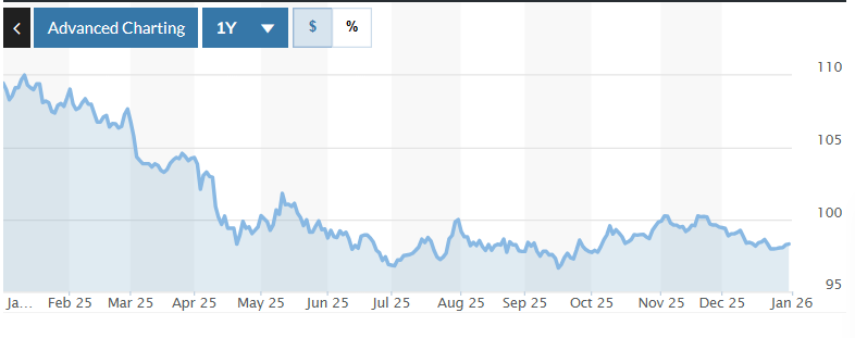 Biểu đồ biến động Chỉ số DXY trong năm 2025. Ảnh: Marketwatch