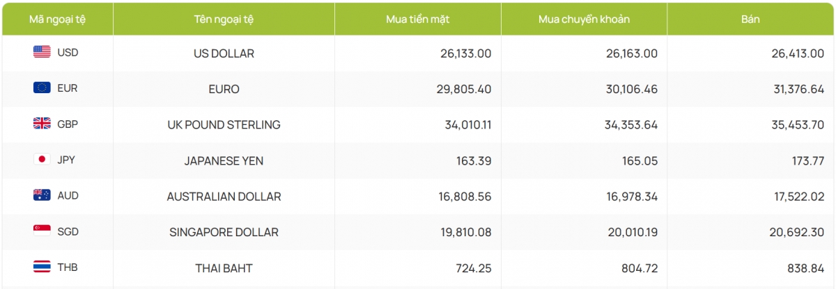 Ngân hàng Vietcombank niêm yết tại 26.133 - 26.413 đồng/USD (mua vào và bán ra), giữ nguyên cả hai chiều kể từ phiên trước đó.