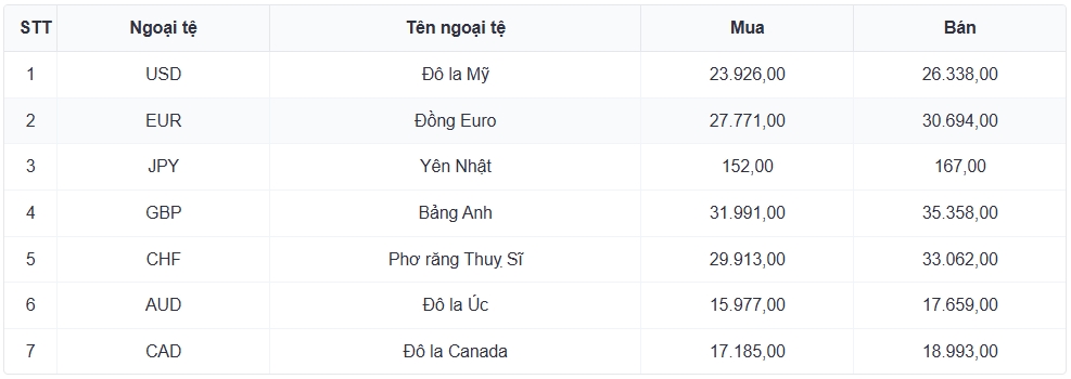 Tỷ giá các ngoại tệ mạnh khác trong giỏ thanh toán quốc tế, tại Ngân hàng Vietcombank được niêm yết như sau: