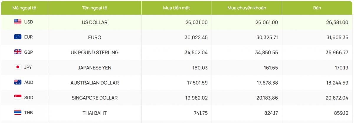 Ngân hàng Vietcombank giảm 20 đồng chiều mua kể từ phiên trước, niêm yết tại 26.031 - 26.381 đồng/USD (mua vào và bán ra).