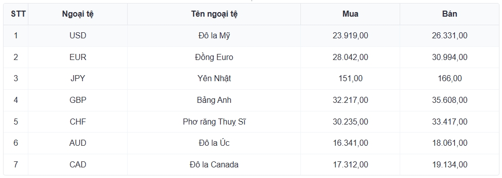Tỷ giá các ngoại tệ mạnh khác trong giỏ thanh toán quốc tế, tại Ngân hàng Vietcombank được niêm yết như sau: