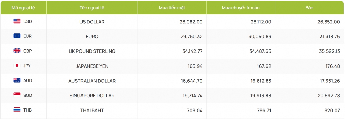 Ngân hàng Vietcombank niêm yết tại 26.082 - 26.352 đồng/USD (mua vào và bán ra), tăng 40 đồng chiều mua và không đổi giá bán kể từ phiên trước.