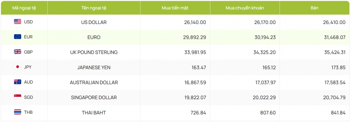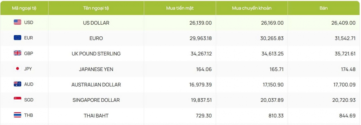 Còn ACB bắt đầu hôm nay với 26.170 đồng/USD mua vào và 26.409 đồng/USD bán ra, không điều chỉnh mới giá mua còn giá bán giảm nhẹ 1 đồng so với phiên liền trước.