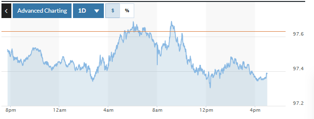 Biểu đồ biến động Chỉ số DXY trong 24 giờ qua. Ảnh: Market watch