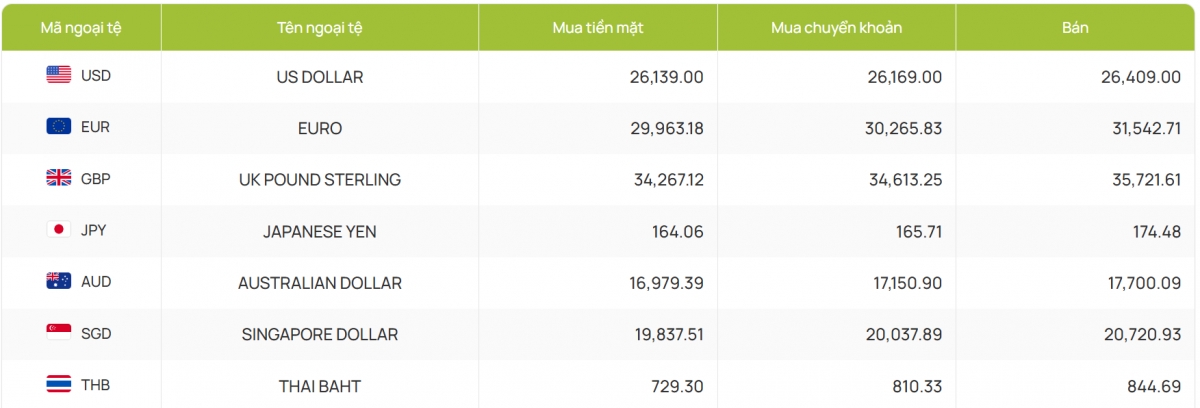 Ngân hàng Vietcombank niêm yết tại 26.139 - 26.409 đồng/USD (mua vào và bán ra), không đổi so với phiên liền trước.