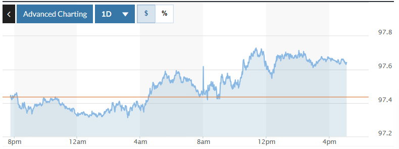 Biểu đồ biến động Chỉ số DXY trong 24 giờ qua. Ảnh: Market watch