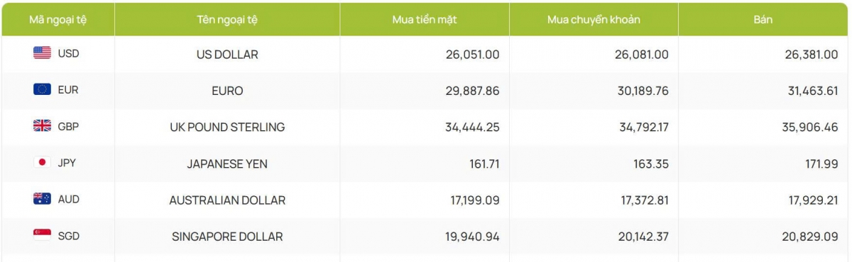 Còn ACB bắt đầu hôm nay giao dịch với 26.070 đồng/USD mua vào và 26.381 đồng/USD bán ra, giữ nguyên giá mua vào và tăng 3 đồng chiều bán kể từ phiên liền trước.