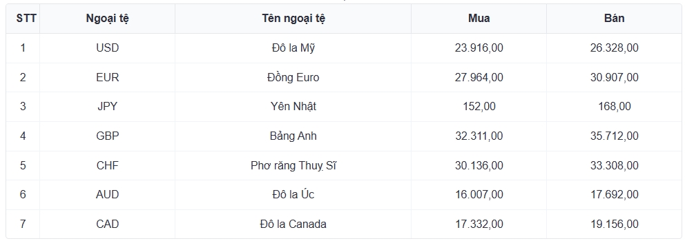 Tỷ giá các ngoại tệ mạnh khác trong giỏ thanh toán quốc tế, tại Ngân hàng Vietcombank được niêm yết như sau: