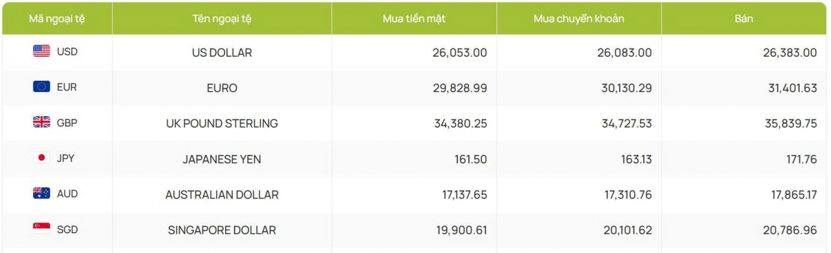 Cụ thể, ngân hàng Vietcombank công bố giao dịch ở mốc 26.053 - 26.383 đồng/USD (mua vào và bán ra), cả hai chiều đều nâng lên cao hơn phiên trước 2 đồng.