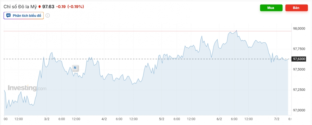 Trên thị trường thế giới, chỉ số USD index (DXY) tuần này hầu hết dao động trên mức 97 điểm. Mức thấp nhất được ghi nhận đạt 97,14 điểm vào sáng thứ Hai. Cập nhật chiều tối Chủ Nhật, chỉ số DXY chạm mốc 97,63 điểm.