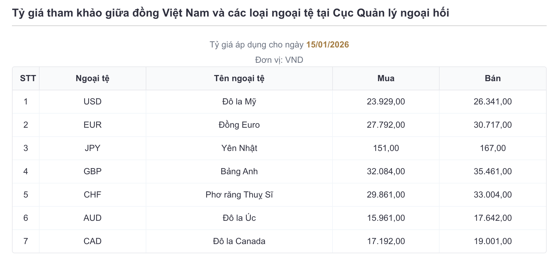 Tỷ giá tham khảo giữa đồng Việt Nam và các loại ngoại tệ tại Cục Quản lý ngoại hối. Nguồn: NHNN