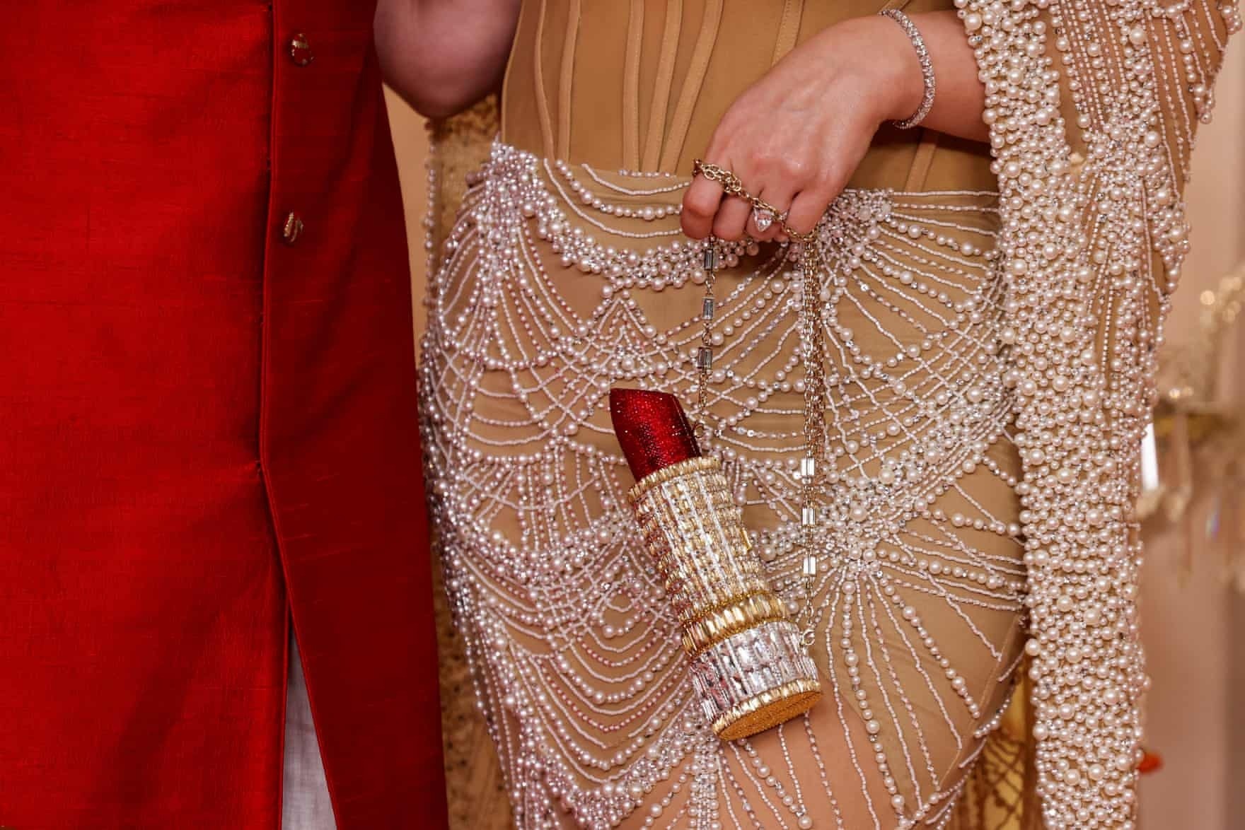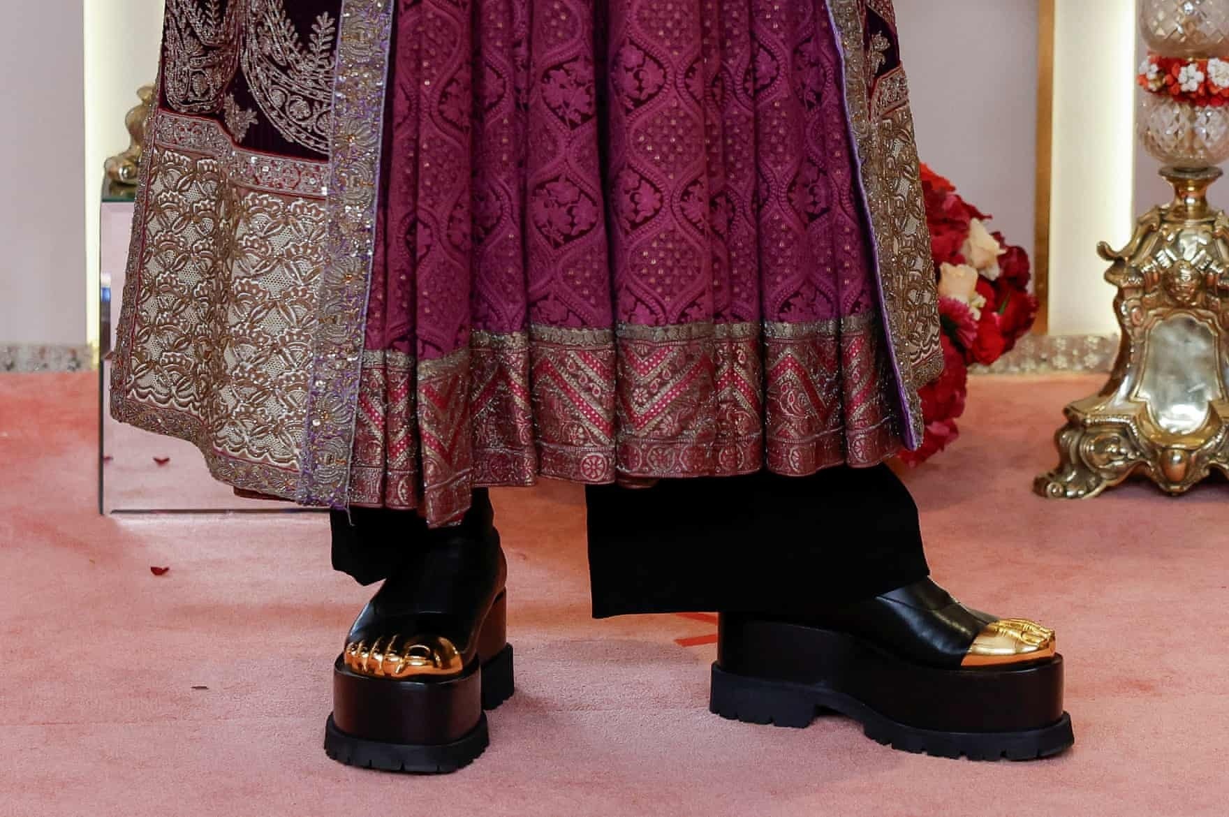 Thời trang tại đám cưới nhà Ambani cũng được nhiều người bàn tán. Khách mời Mona Kattan, Chủ tịch toàn cầu của Huda Beauty, xách một chiếc túi hình thỏi son. Còn stylist Law Roach đi đôi boots độc đáo của Schiaparelli.