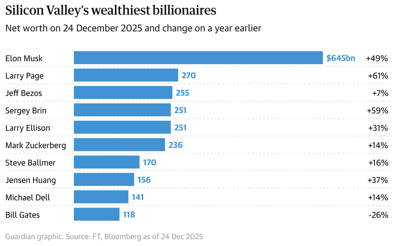 Tài sản của các tỷ phú công nghệ Mỹ tính đến ngày 24/12. Biểu đồ: Guardian.