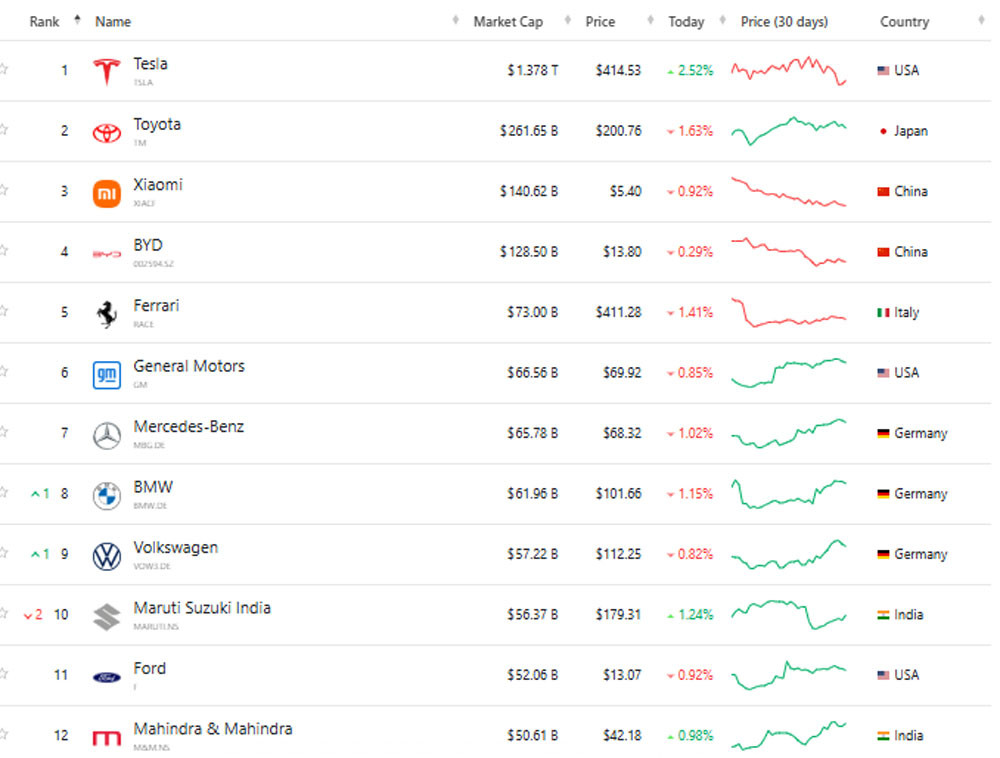 Con số 1.000 tỷ USD tương đương với 10 hãng xe ô tô xếp sau Tesla, bao gồm: Toyota (262 tỷ USD tính tới 17/11), Xiaomi (141 tỷ USD), BYD (128 tỷ USD), Ferrari (73 tỷ USD), General Motors (67 tỷ USD), Mercedes-Benz (66 tỷ USD), BMW (62 tỷ USD), Volkswagen (57 tỷ USD), Maruti Suzuki India (56 tỷ USD) và Ford (52 tỷ USD).