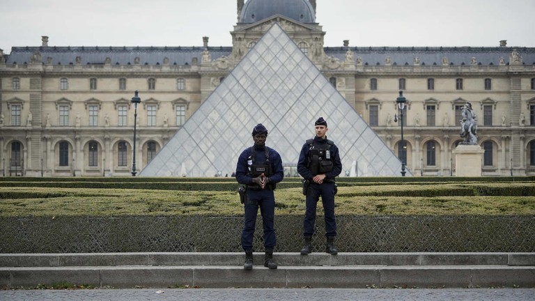 Cảnh sát đứng gác bên ngoài bảo tàng Louvre vào ngày 19/10. Ảnh: Getty.