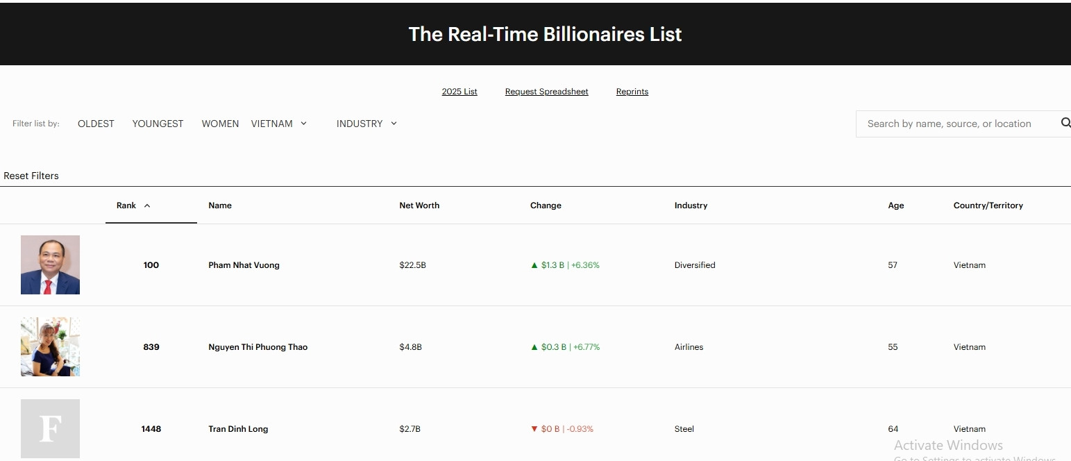 Trước đó, hồi đầu năm 2025, theo danh sách tỷ phú thường niên của Forbes công bố ngày 4/1, ông Phạm Nhật Vượng sở hữu 6,5 tỷ USD, tăng 2,1 tỷ USD so với năm 2024.
