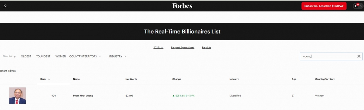 Theo thống kê mới nhất của Forbes (tính đến ngày 10/3/2026), Việt Nam có 1 tỷ phú lọt top 105 người giàu nhất thế giới, đó là ông chủ Vingroup Phạm Nhật Vượng, với khối tài sản ước tính 23,9 tỷ USD. Đây cũng là mức tài sản cao nhất từng được Forbes ghi nhận đối với một doanh nhân Việt Nam.