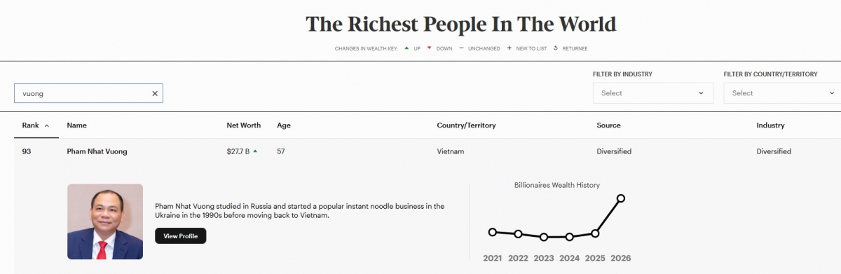 Theo thống kê mới nhất của Forbes (tính đến ngày 10/3/2026), Việt Nam có 1 tỷ phú lọt top 93 người giàu nhất thế giới, đó là ông chủ Vingroup Phạm Nhật Vượng, với khối tài sản ước tính 27,7 tỷ USD. Đây cũng là mức tài sản cao nhất từng được Forbes ghi nhận đối với một doanh nhân Việt Nam.