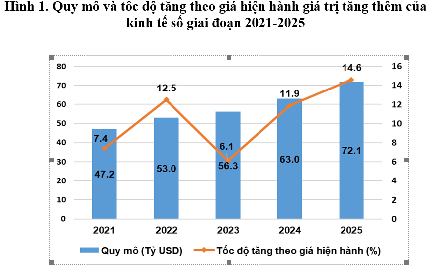 Tỷ trọng giá trị tăng thêm của kinh tế số trong GDP của Việt Nam liên tục tăng trong giai đoạn 2021-2025, từ 12,87% GDP năm 2021 lên 14,02% GDP năm 2025, trung bình giai đoạn này ước đạt khoảng 13,2%, trong đó ngành kinh tế số lõi đóng góp 8,13% và số hóa các ngành khác là 5,05%.