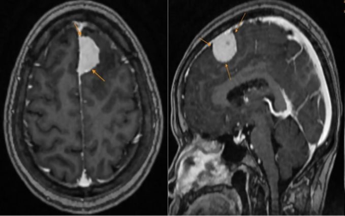 Kết quả MRI khiến cô H. bất ngờ khi có một khối u lớn vùng trán trái, kích thước khoảng 27x15mm, nghi ngờ u màng não. Nhờ phát hiện kịp thời, bác sỹ đã tư vấn phương án can thiệp an toàn và hiệu quả, hạn chế rủi ro biến chứng.
