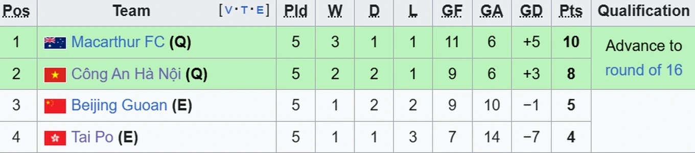 Bảng xếp hạng bảng E cúp C2 châu Á (Ảnh: Wiki).