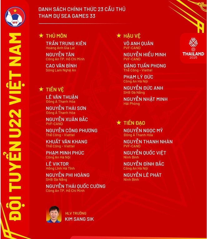 Huấn luyện viên Kim Sang-sik đã chính thức chốt danh sách 23 cầu thủ của đội tuyển U22 Việt Nam sẽ lên đường tham dự SEA Games 33 tại Thái Lan. Quyết định nhân sự cuối cùng được đưa ra vào sáng 30/11, trong đó bất ngờ lớn nhất là sự vắng mặt của tiền đạo Bùi Vĩ Hào.