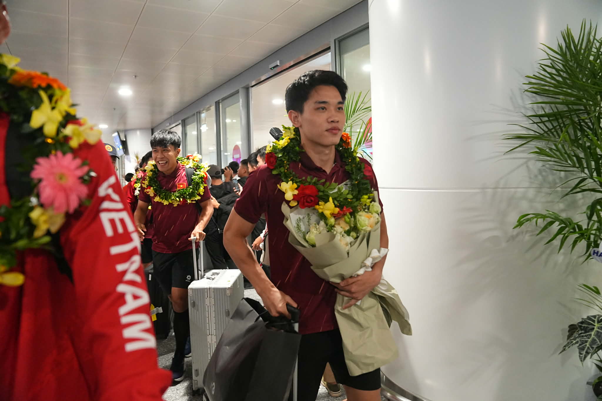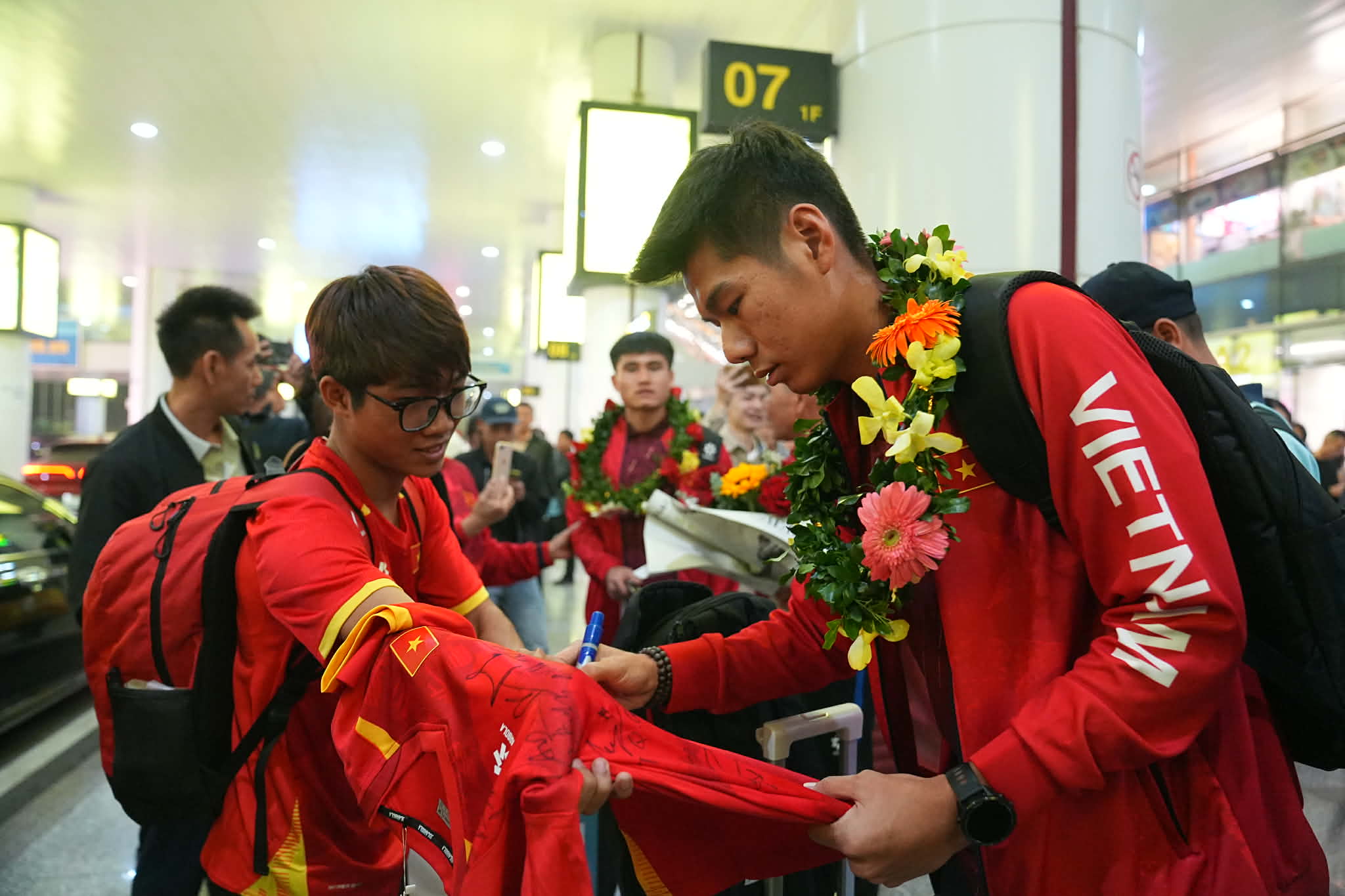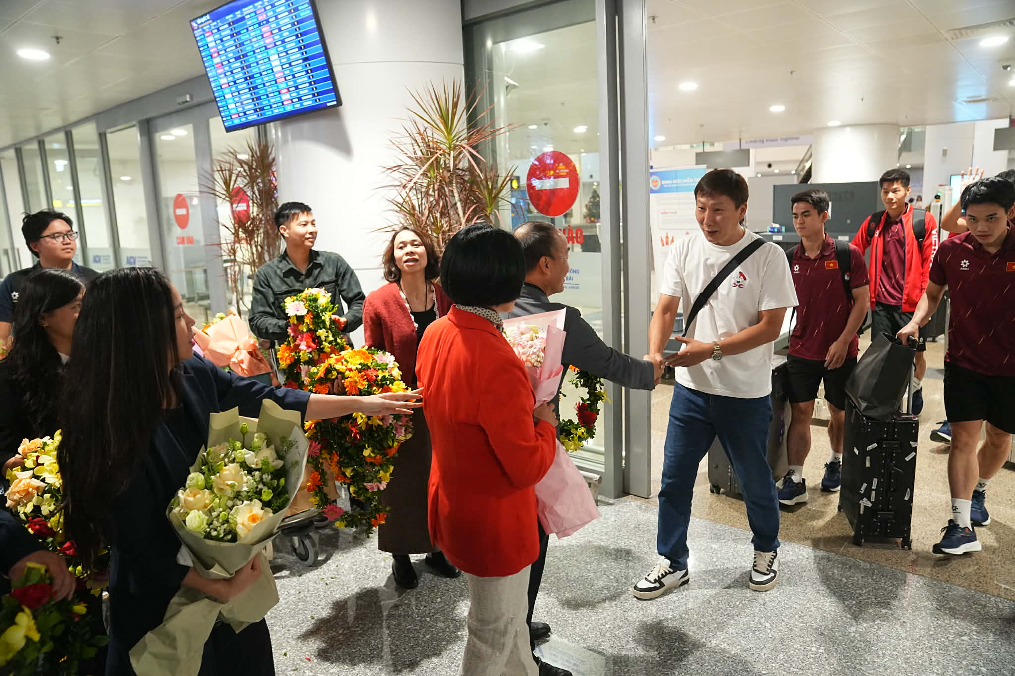 Khoảng 19 giờ, các cầu thủ hoàn thành thủ tục nhập cảnh, lấy hành lý và có mặt ở cửa ra sảnh Nhà ga T2. Các chiến binh sao vàng cùng ban huấn luyện được đông đảo người thân, người hâm mộ chào đón nồng nhiệt.