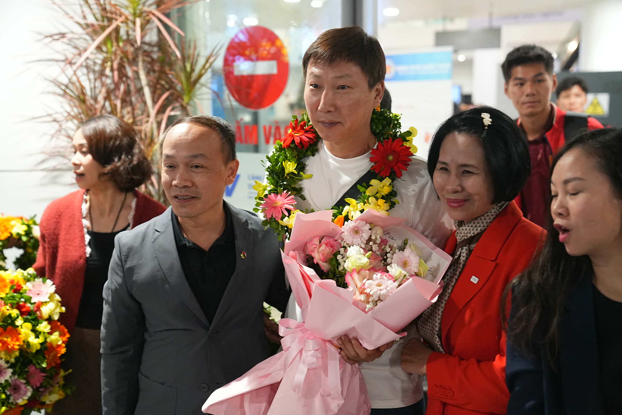 Huấn luyện viên Kim Sang-sik dẫn đoàn, nhận hoa chúc mừng từ lãnh đạo VFF.