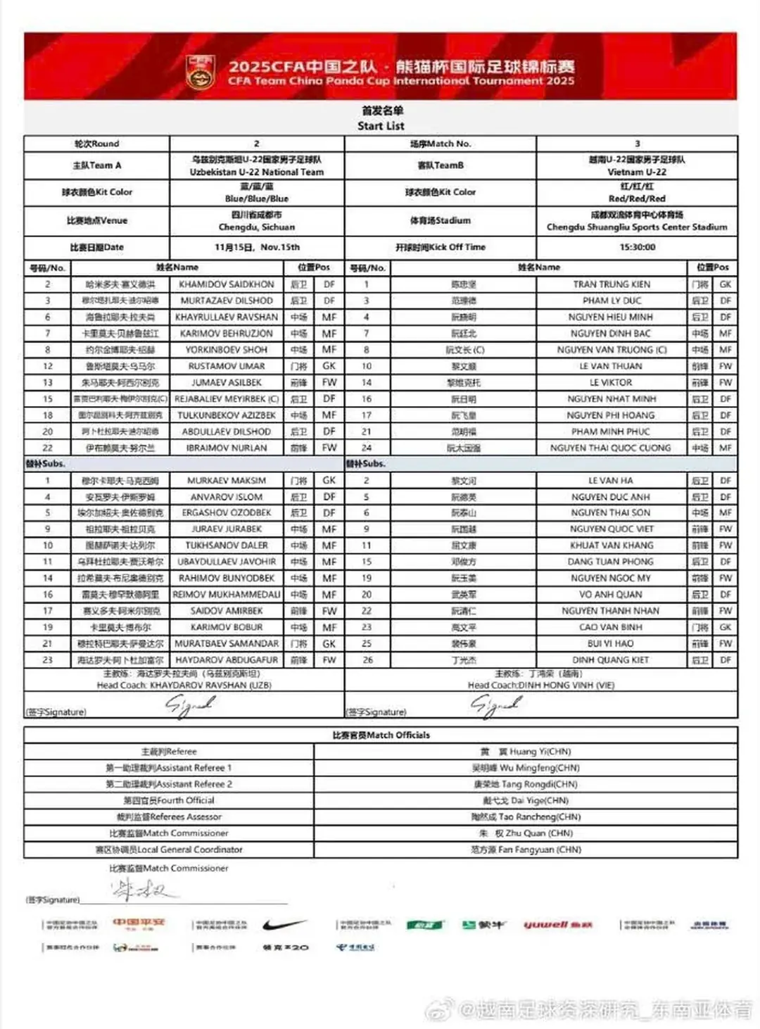 Đội hình U22 Việt Nam thay đổi khá nhiều so với trận đấu đầu tiên gặp Trung Quốc. Thủ môn Trung Kiên được vào sân ngay từ đầu thay cho Cao Văn Bình. Ở hàng thủ, hậu vệ phải Minh Phúc cũng có tên trong đội hình xuất phát, bên cánh đối diện là Nguyễn Phi Hoàng. 3 trung vệ ổn định nhất trong đội hình hiện tại là Hiểu Minh, Nhật Minh và Lý Đức vẫn là những sự lựa chọn hàng đầu. Ở tuyến giữa, tiền vệ trung tâm Nguyễn Thái Quốc Cường song hành cùng đội trưởng Nguyễn Văn Trường. 3 mũi tấn công được HLV Đinh Hồng Vinh lựa chọn là Đình Bắc, Viktor Lê và Lê Văn Thuận.