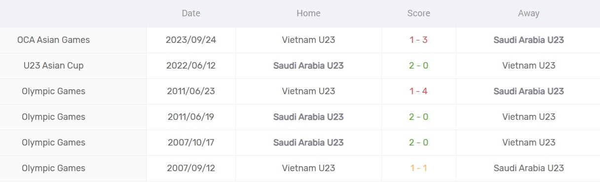 Trong 6 lần chạm trán chính thức gần nhất tại các giải đấu lớn như Asian Cup, Asiad hay Vòng loại Olympic, U23 Việt Nam chưa một lần biết mùi chiến thắng. Chúng ta nhận thất bại tới 5 trận và chỉ có duy nhất 1 trận hòa (tỷ số 1-1 tại Vòng loại Olympic 2008).