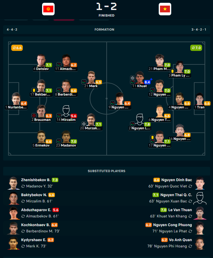 Nhân tố tạo nên bước ngoặt lớn nhất chính là Văn Thuận. Phút 87, sau một pha không chiến kỹ thuật của cầu thủ này, hậu vệ đối phương đã lúng túng phản lưới nhà, ấn định chiến thắng 2-1 cho U23 Việt Nam. Với đóng góp trực tiếp vào bàn thắng quyết định, Văn Thuận nhận mức điểm 7,2 và được xem là quân bài chiến lược hoàn hảo trong trận đấu này.