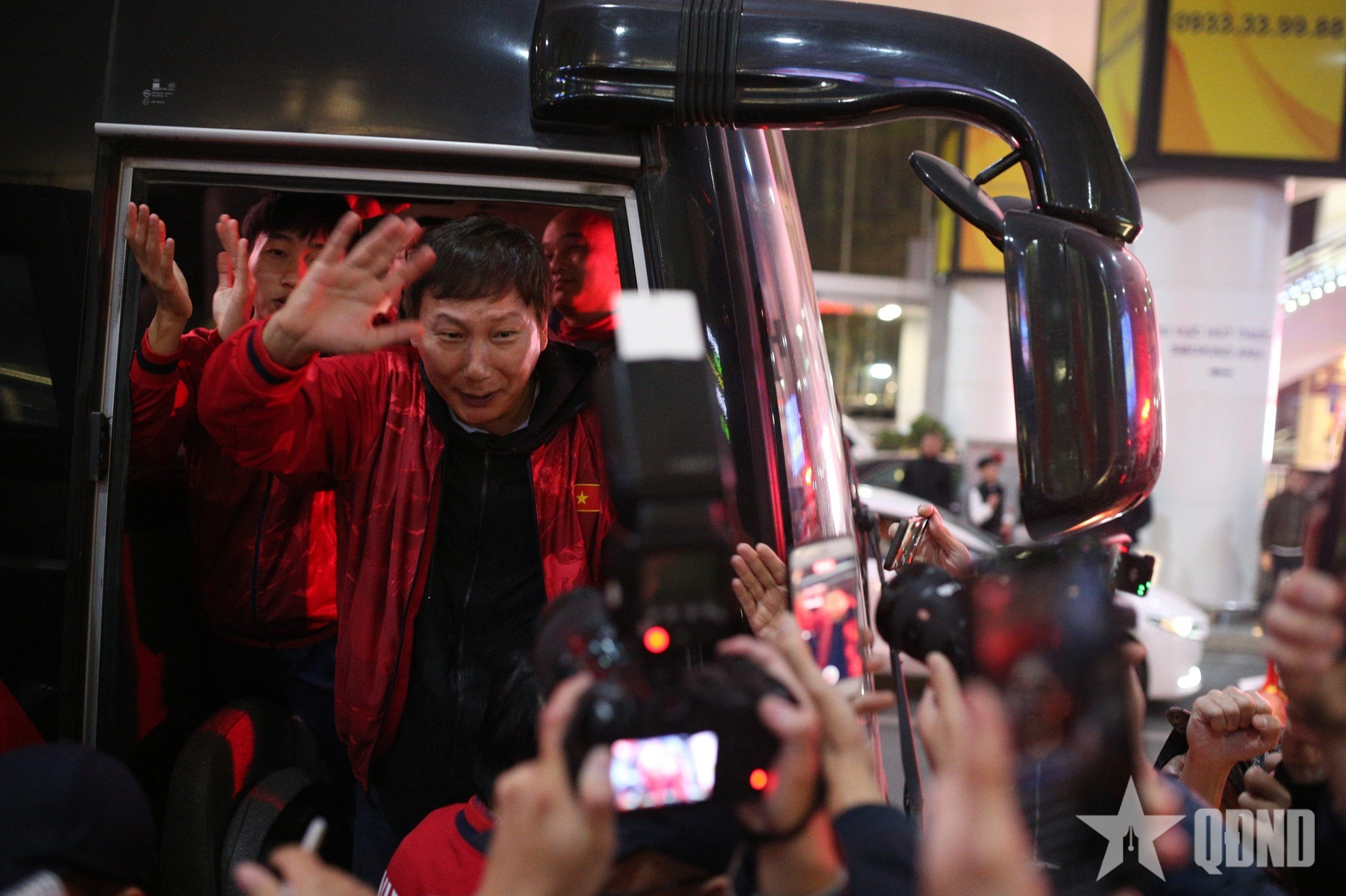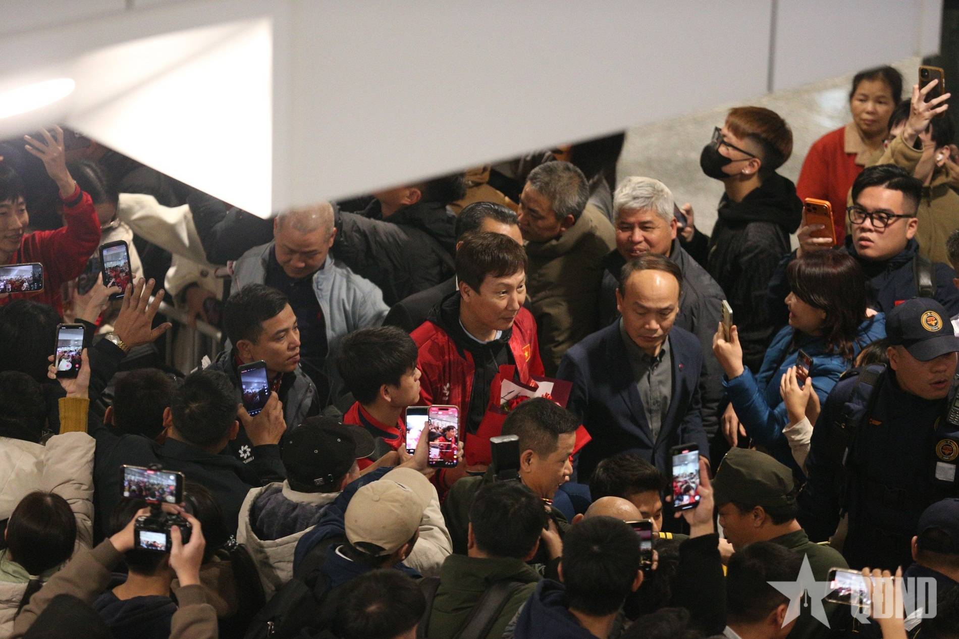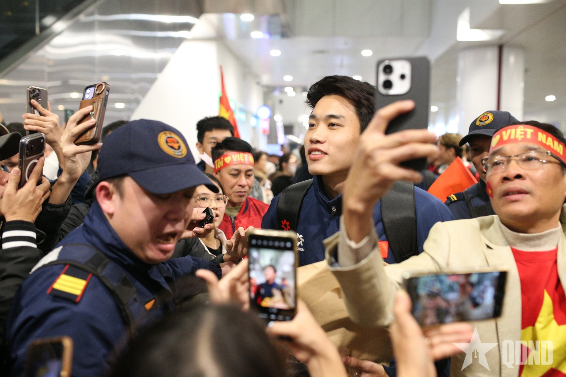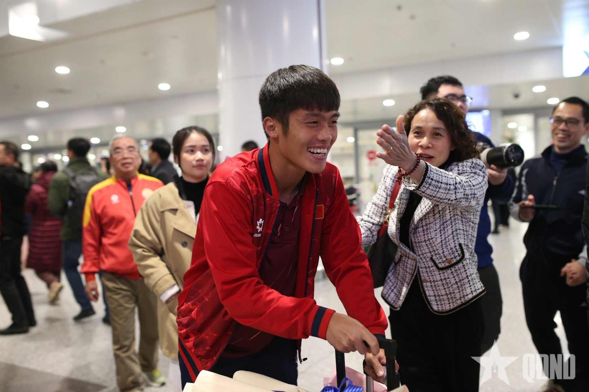 Tại sân bay Nội Bài, đông đảo người hâm mộ và người nhà cầu thủ đã có mặt từ sớm để chung vui thành tích giành huy chương đồng của thầy trò huấn luyện viên Kim Sang-sik.