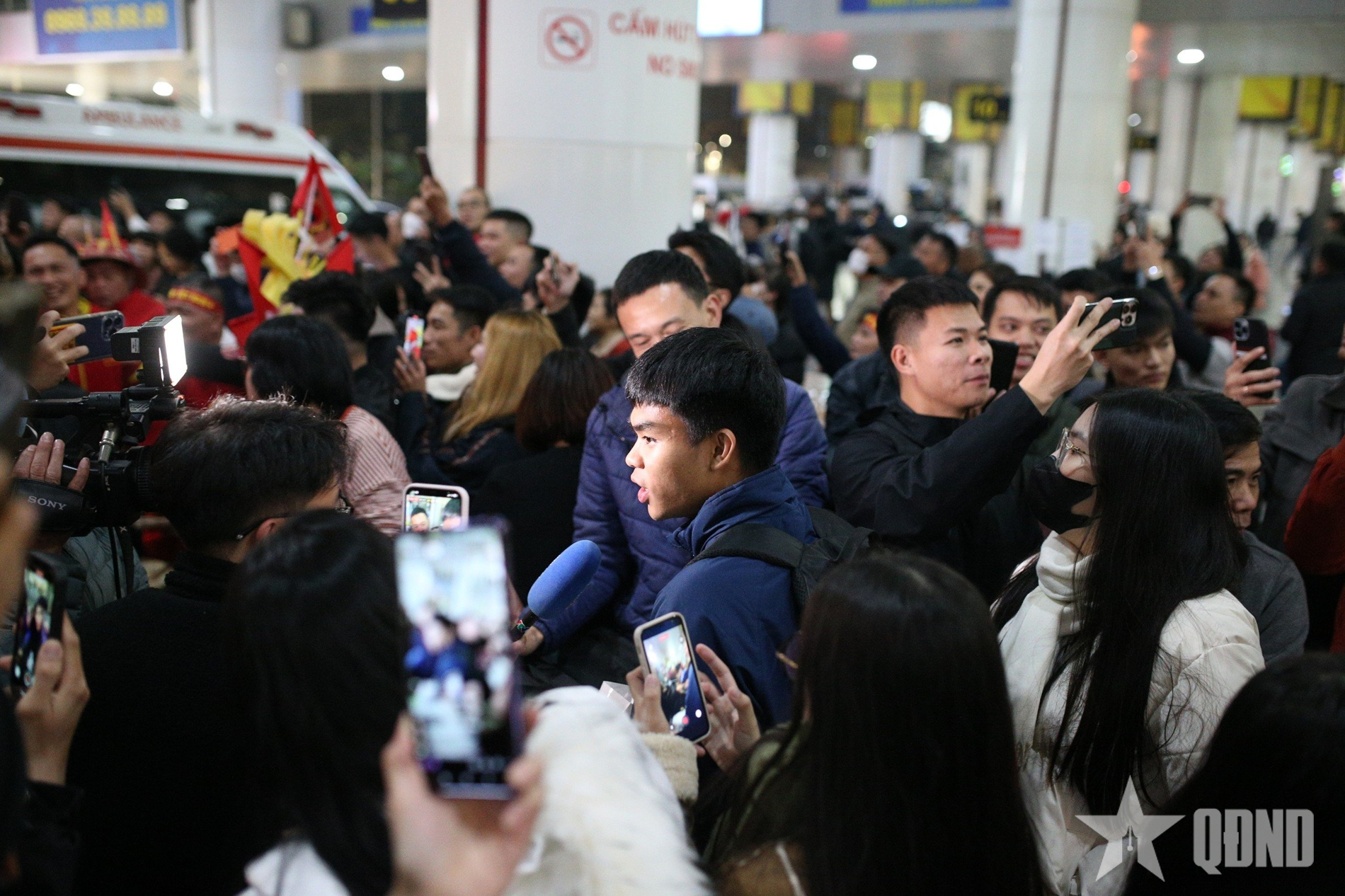 Các thành viên U23 Việt Nam tiến ra sảnh chờ trong sự chào đón của đông đảo người hâm mộ. Ảnh: VIỆT AN