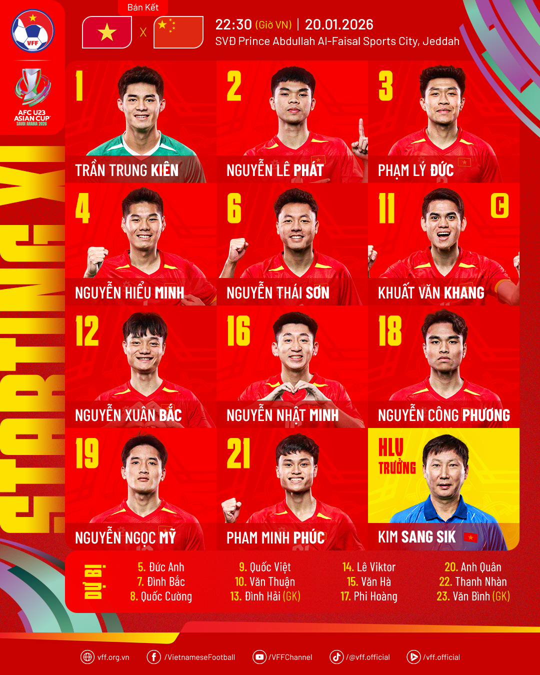 Trên sân Prince Abdullah Al Faisal tối 20/1, U23 Trung Quốc bước vào bán kết với một diện mạo khác hẳn. Họ thay tới 6 vị trí so với tứ kết, đá chủ động hơn, và chỉ cần vài phút đầu hiệp hai để biến thế cân bằng thành khoảng cách rõ rệt: Peng Xiao và Xiang Yuwang ghi liền hai bàn trong thời gian từ phút 47–52, trước khi Wang Yudong ấn định 3-0 ở phút bù 90+8.