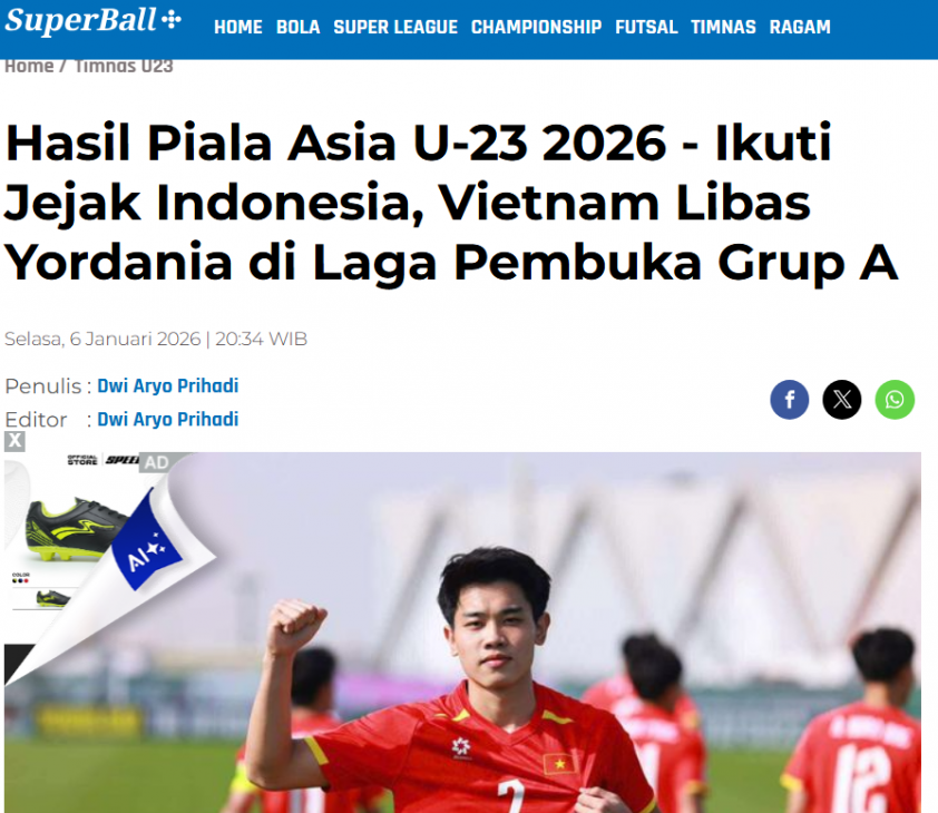 Báo Indonesia phản ứng về chiến thắng ấn tượng của U23 Việt Nam tại VCK U23 châu Á 2026 (Ảnh: chụp màn hình).