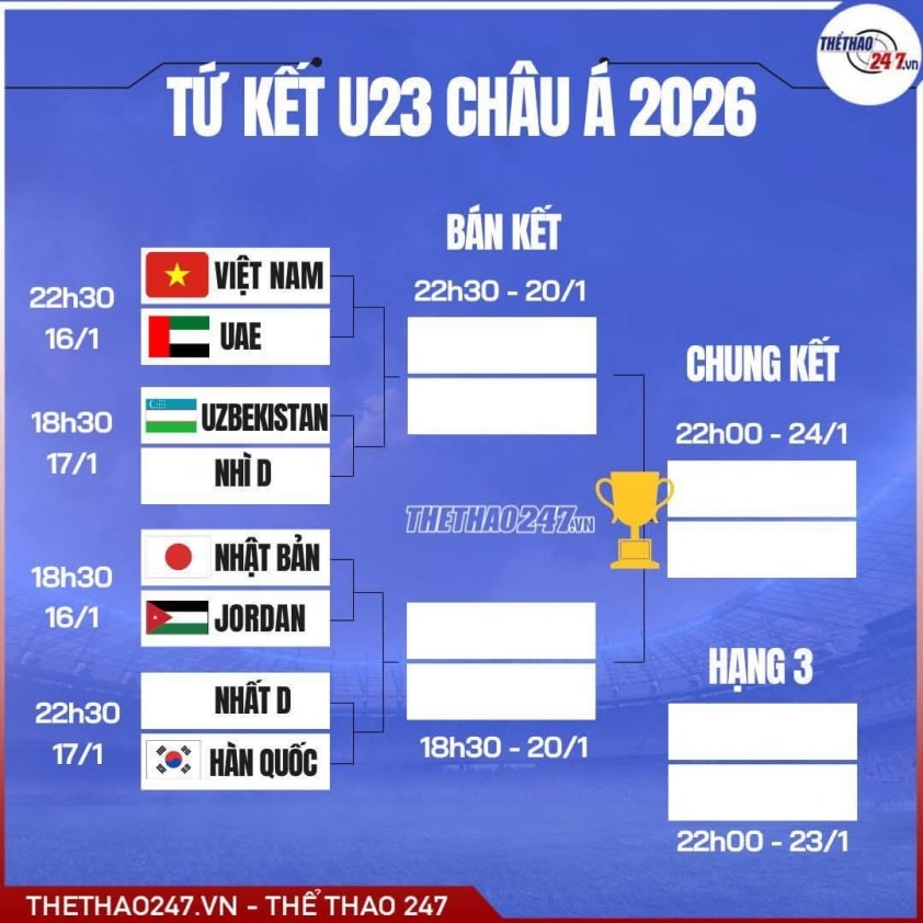 Theo lịch thi đấu chính thức, U23 Việt Nam sẽ bước vào trận tứ kết gặp U23 UAE vào lúc 22h30 ngày 16/1. Với phong độ và sự tự tin đang lên cao, người hâm mộ hoàn toàn có cơ sở để tin tưởng vào một tấm vé tiến sâu hơn vào bán kết, tiếp tục viết nên những trang sử mới cho bóng đá nước nhà.