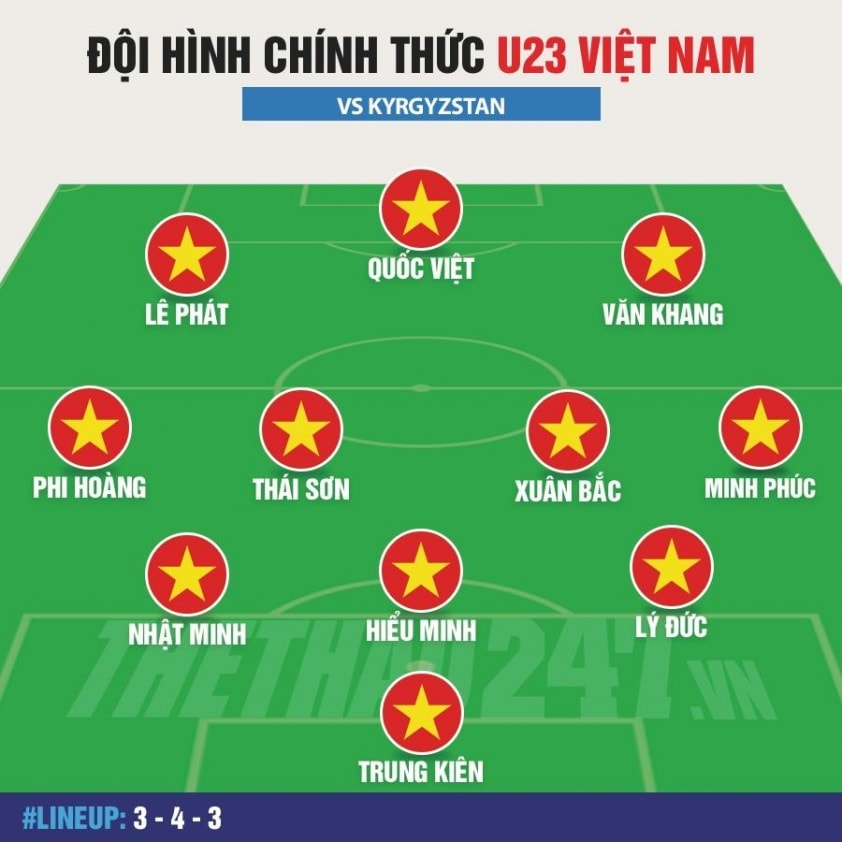 Đội hình xuất phát của U23 Việt Nam bao gồm: Trung Kiên, Hiếu Minh, Nhật Minh, Minh Phúc, Lý Đức, Văn Khang, Xuân Bắc, Thái Sơn, Phi Hoàng, Đình Bắc, Lê Phát. Sự trở lại của Thanh Nhàn sau khi bình phục chấn thương cũng mang lại thêm giải pháp đột biến từ hành lang cánh trong hiệp hai.