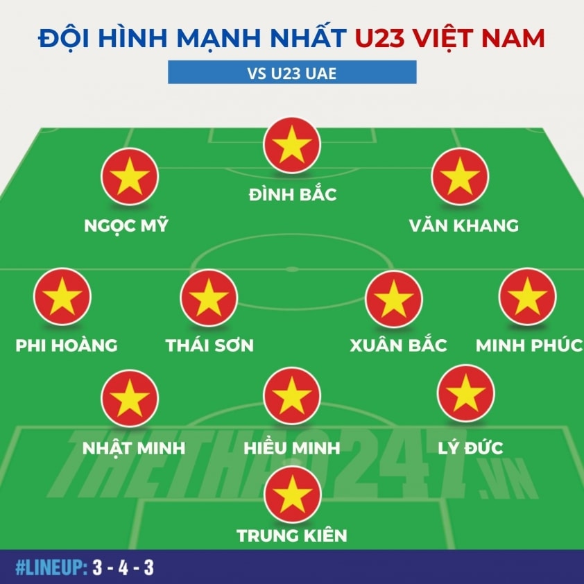 Trên hàng công, Nguyễn Ngọc Mỹ đang là cái tên gây bất ngờ lớn nhất. Tiền đạo này vừa có pha kiến tạo tinh tế giúp Nguyễn Đình Bắc lập công trong trận đấu gần nhất. Sự cơ động của Ngọc Mỹ kết hợp với kinh nghiệm của đội trưởng Khuất Văn Khang và khả năng bùng nổ của Đình Bắc sẽ là thử thách lớn cho hàng thủ U23 UAE.