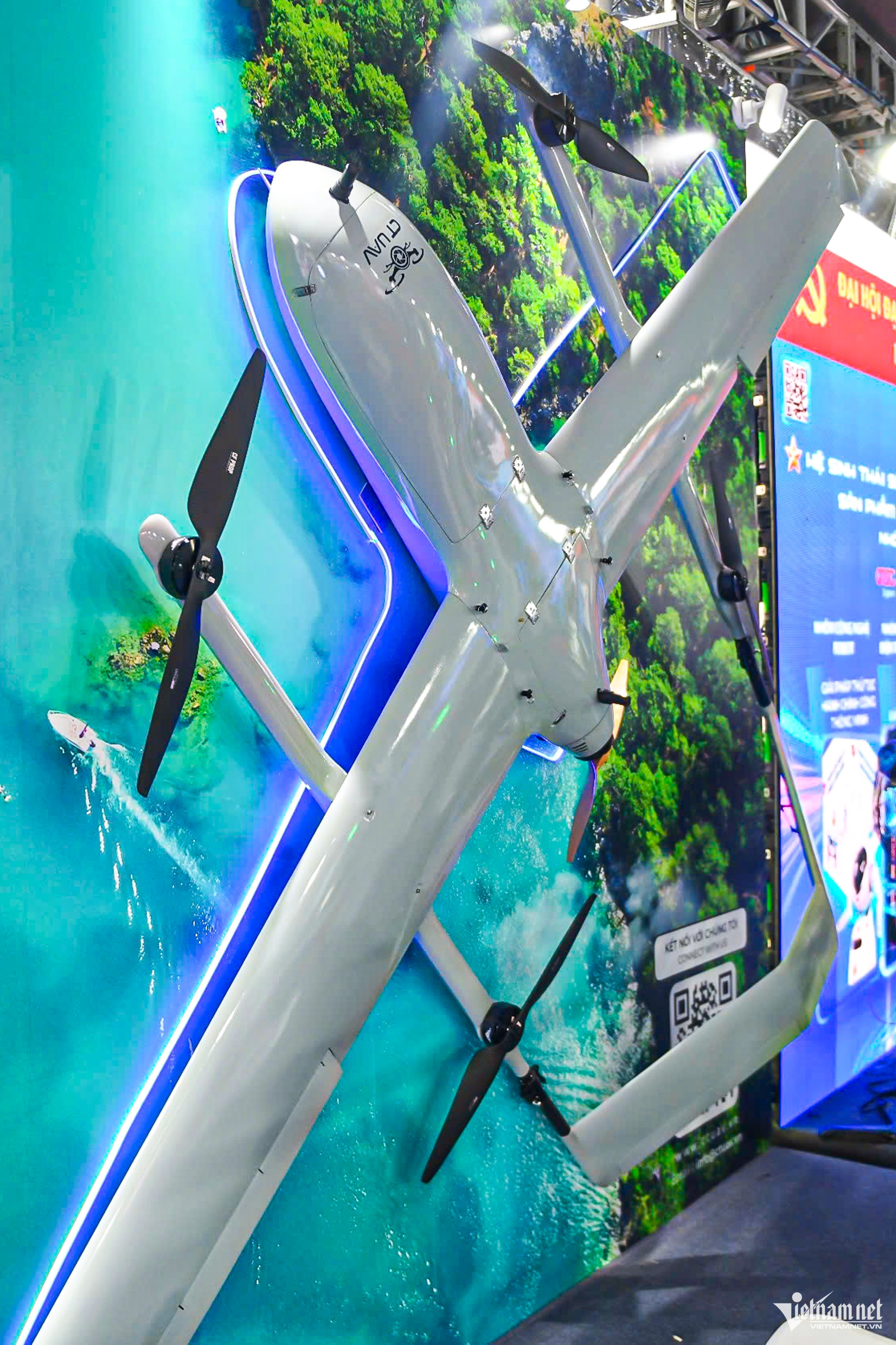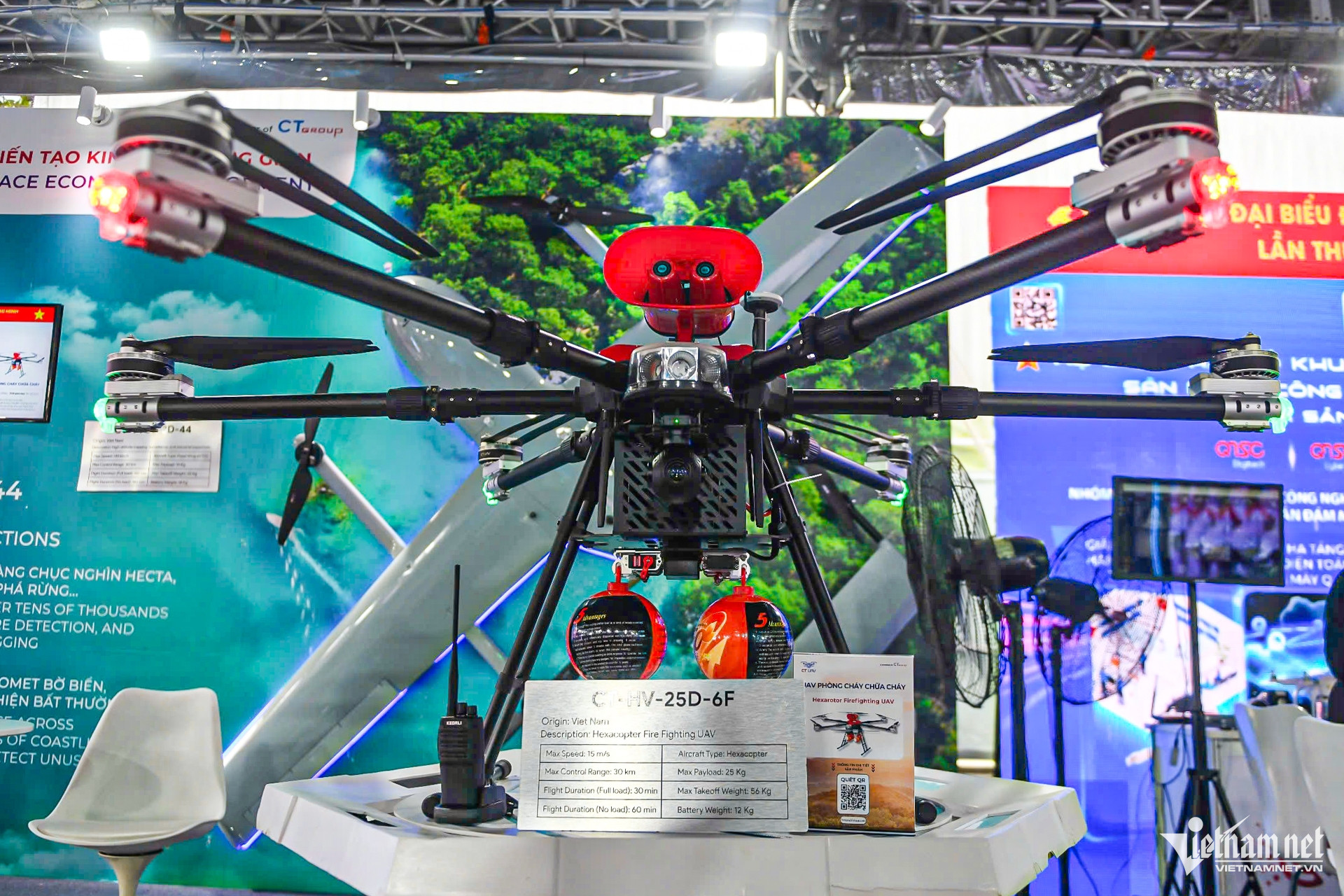 Tại triển lãm, đại diện Tập đoàn CT Group cho biết, phía doanh nghiệp giới thiệu mẫu thiết bị bay không người lái (UAV) VTOL 4,4m được ứng dụng trong tuần tra, phát hiện cháy rừng, phá rừng, hoặc tuần tra dọc bờ biển, biên giới, hải đảo...; hay mẫu Hexarotor Firefighting UAV có thể hỗ trợ cứu hộ hoàn toàn tự động bằng AI trước khi cảnh sát phòng cháy, chữa cháy đến.